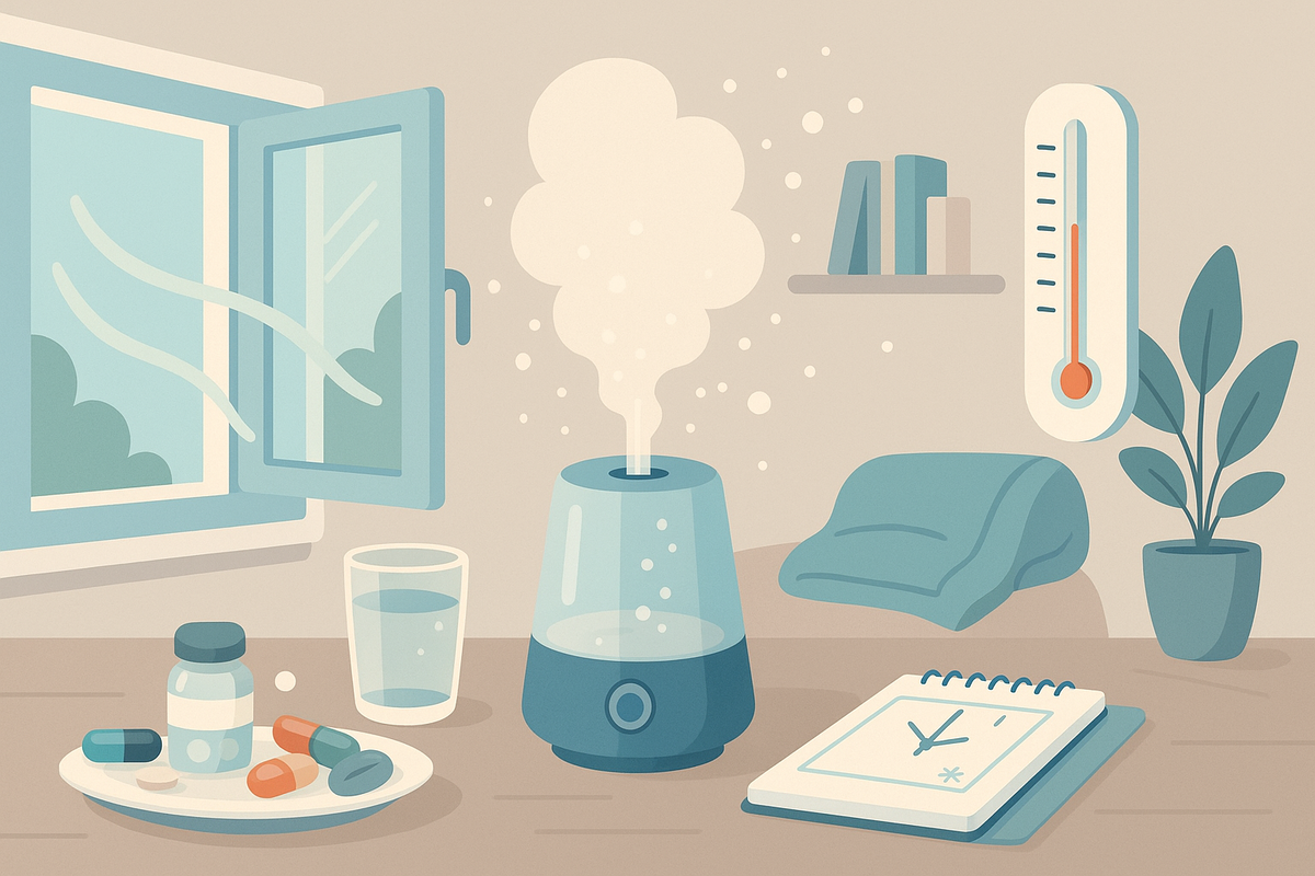 Проветривание — короткими циклами: 3–5 раз в день по 5–10 минут. Это снижает концентрацию вирусных частиц в воздухе и улучшает самочувствие.
