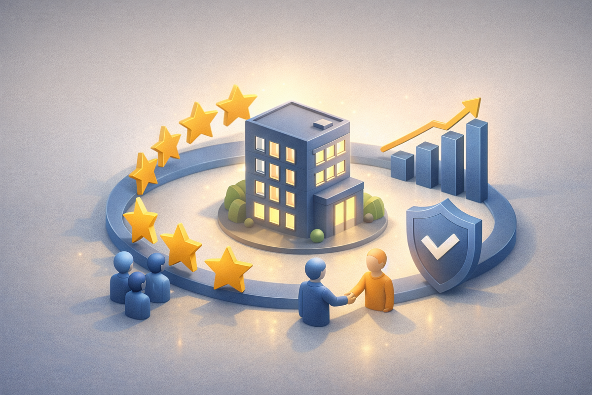 Здание компании в центре окружено звёздами, графиком роста и символом доверия как отражение влияния отзывов