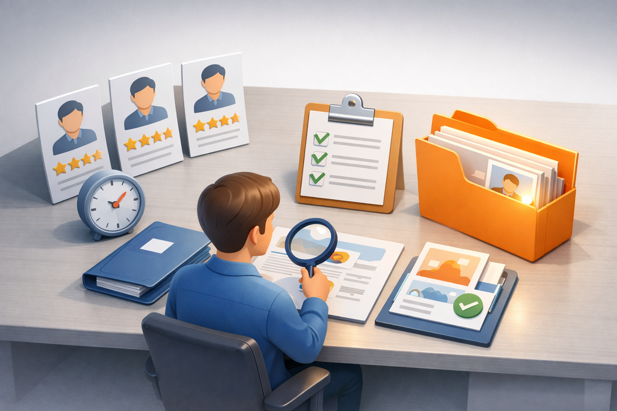 Человек сравнивает карточки исполнителей со звёздами, портфолио и чек-листом перед выбором подрядчика