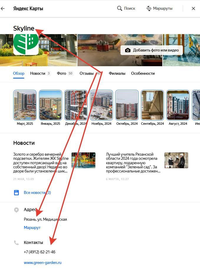 Убедитесь, что вы открыли в Яндексе нужную компанию с адресом и номером телефона, которые указаны на изображение.